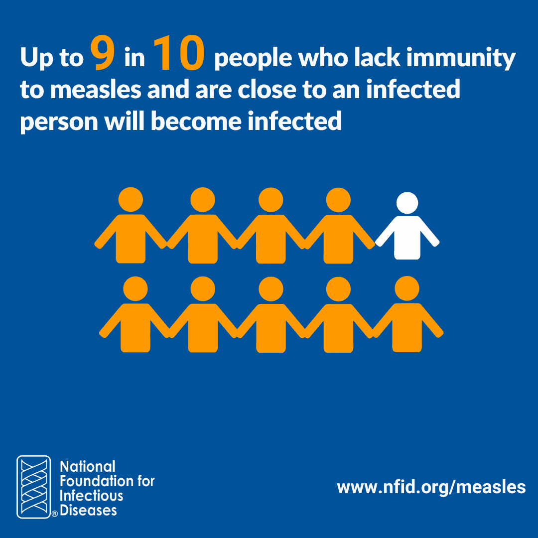 #DYK: #Measles is so contagious that if an individual has measles, up to 9 out of 10 of their close contacts who are not immune will also become infected? #GetVaccinated to help #PreventMeasles and learn more at www.nfid.org/measles.