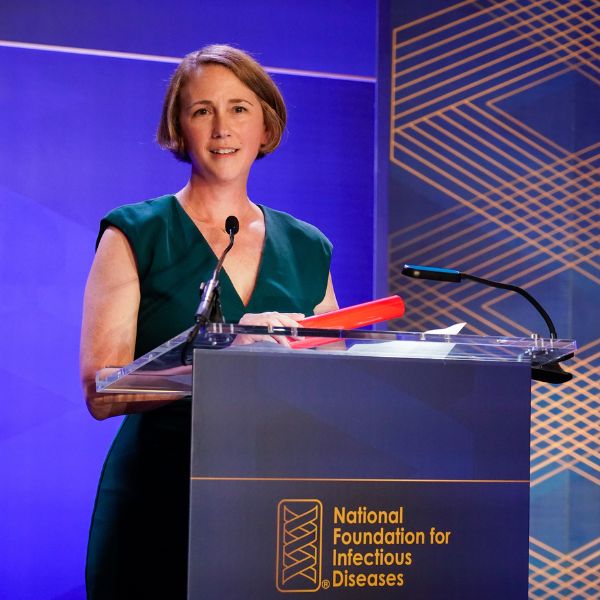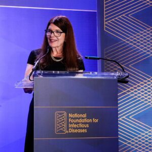 In recognition of her groundbreaking work as a visionary physician-scientist and humanitarian whose contributions have helped change the course of TB and HIV/AIDS, NFID honored Anne E. Goldfeld, MD. Her fusion of scientific discovery, clinical care, and humanitarian action has driven breakthroughs in treatment and expanded access to lifesaving care. A visionary leader at the intersection of science and service, in parallel with her work as a physician-scientist at Harvard Medical School, Goldfeld co-founded transformative treatment and research programs in Cambodia for TB, drug-resistant TB, and HIV—and later for drug-resistant TB in Ethiopia—bringing care to some of the world’s most underserved populations. Applying her scientific expertise to TB and HIV, her work has provided a new understanding behind the immune response to TB and TB/HIV co-infection and changed global treatment guidelines for HIV/TB treatment, which is estimated to have saved more than 150,000 lives annually over the last 14 years.