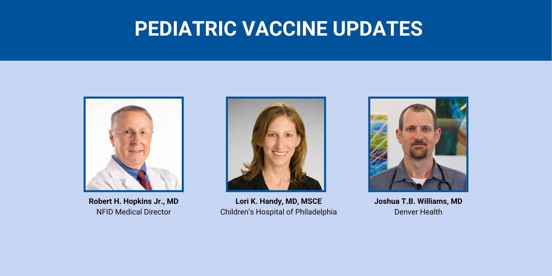 NFID Medical Director Robert (Bob) H. Hopkins, Jr., MD, moderates the discussion with Lori K. Handy, MD, MSCE, Attending Physician at Children’s Hospital of Philadelphia and Associate Professor of Clinical Pediatrics at Perelman School of Medicine at the University of Pennsylvania, and Joshua T.B. Williams, MD, Pediatrician at Denver Health and Associate Professor of Pediatrics at the University of Colorado Anschutz School of Medicine.